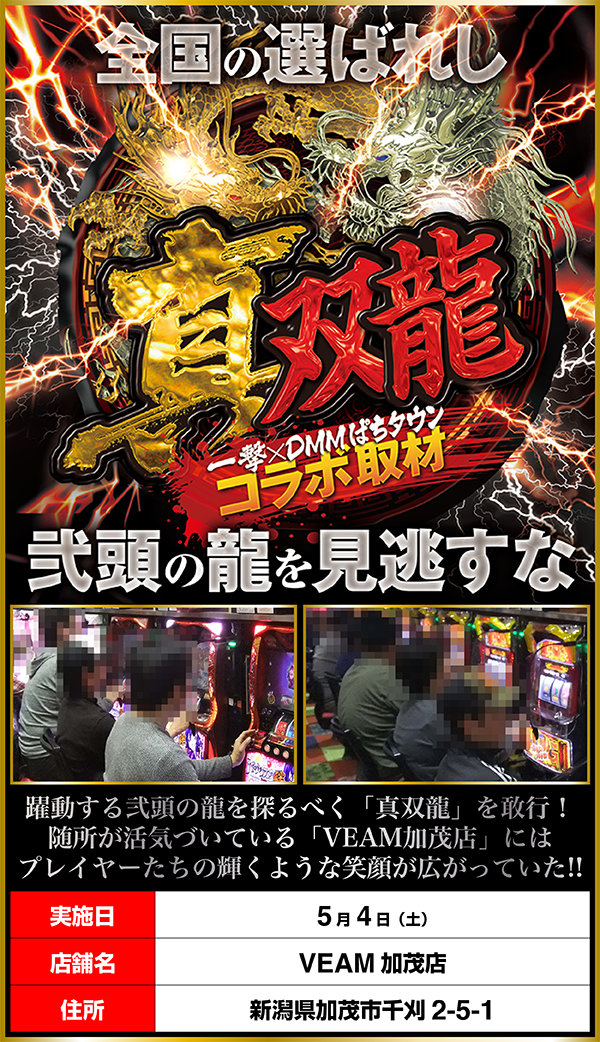 「バジリスク~甲賀忍法帖~絆」を中心に、幅広いスペックの機種が盛り上がっていた「VEAM加茂店」。龍の存在を探っていくなかで、多くのプレイヤーが活躍する素敵な場面に出会えた。