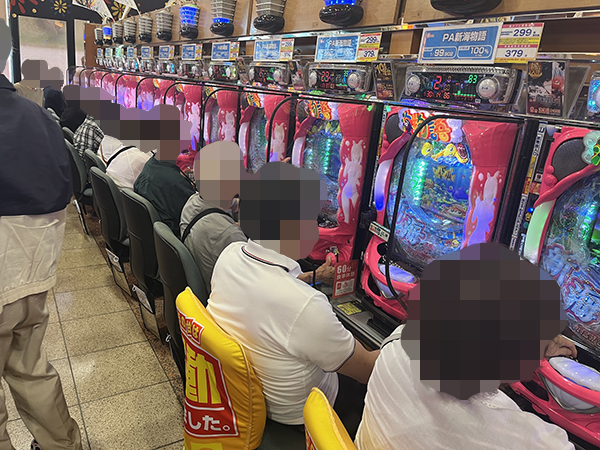 16時ごろの100円/89玉パチンコでは「PA大海物語5 Withアグネス・ラム」や「PA大海物語5ブラックLT99ver.」、「PA新海物語」といった甘海シリーズで好調なプレイヤーが多数見受けられ、時折見せる嬉しそうな表情が印象に残っている。