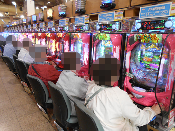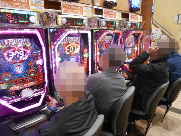 14時ごろの100円/89玉パチンコを見てみると「PAコマコマ倶楽部 with 坂本冬美 ごらくバージョン」や「P J-RUSH5 RSJ」が高稼働。プレイヤーの嬉しそうな表情を多数確認している。