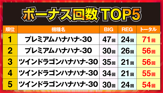 「プレミアムハナハナ-30」が1位と2位に並び、ボーナス回数71回を記録した台が首位を獲得!