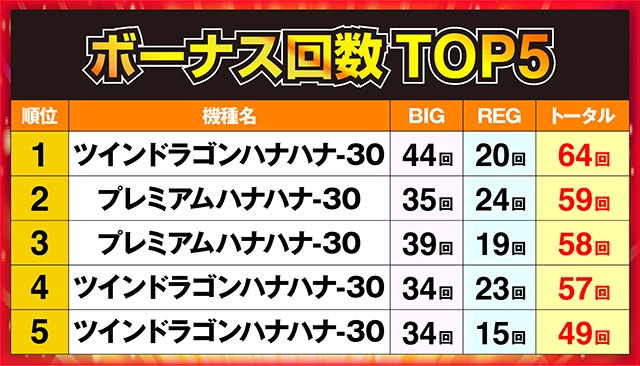 ボーナス回数64回を記録した「ツインドラゴンハナハナ-30」の1台が首位を獲得!