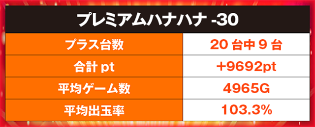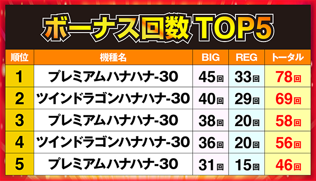 「プレミアムハナハナ-30」から3台がTOP5入りをはたし、78回のボーナスに当選した1台が堂々のトップ!!