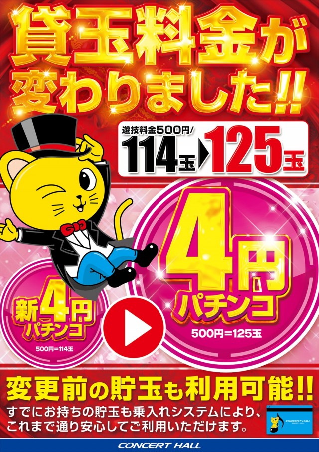 おはようございます‼ 本日より4円貸玉料金が変更となります😌