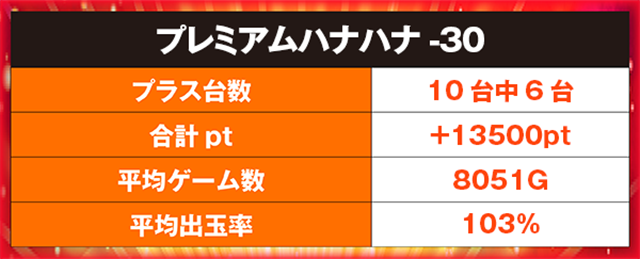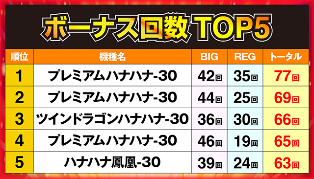 3機種が入り混じるランキングでトップに立ったのは、77回を記録した「プレミアムハナハナ-30」の1台であった。