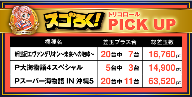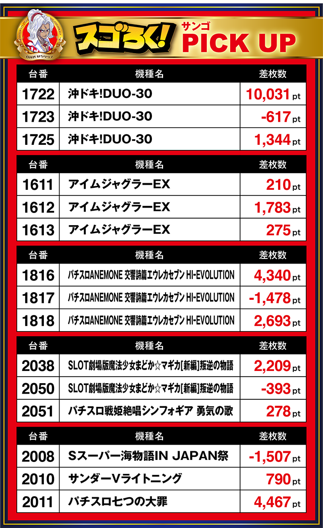 「パチスロANEMONE 交響詩篇エウレカセブン HIーEVOLUTION」にも+4,000ptオーバーの台があるなど、優秀台が盛りだくさんだ。