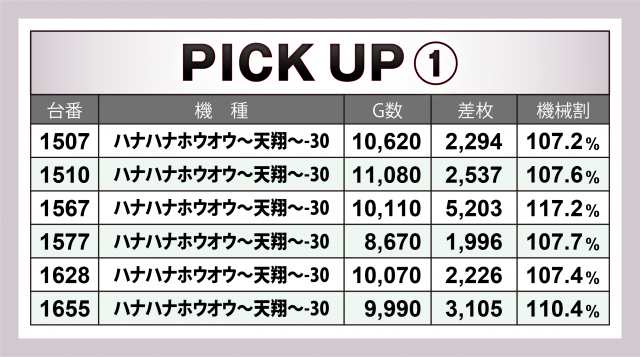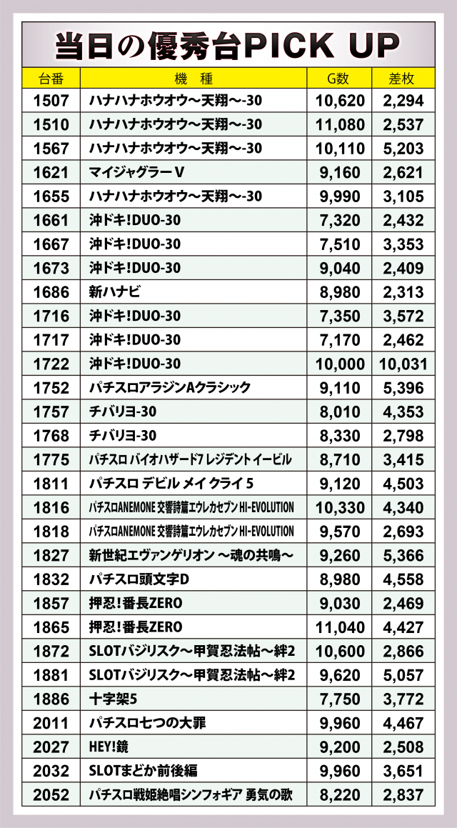 まずは優秀30台のPICK UPから。30台全てが差枚数+2千枚以上を達成し、さらに+4千枚以上は11台という結果に。後述する好調4機種以外では『チバリヨ-30』『パチスロアラジンAクラシック』『パチスロ デビル メイ クライ 5』『パチスロANEMONE 交響詩篇エウレカセブン HIーEVOLUTION』『新世紀エヴァンゲリオン 〜魂の共鳴〜』『パチスロ七つの大罪』などのハイスコアが際立った。