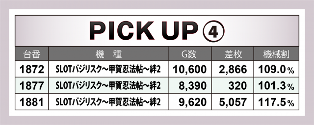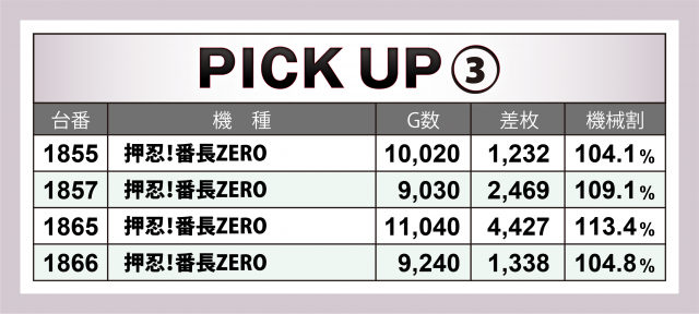 続いては当日好調台が目立った4機種。中でも『沖ドキ!DUO-30』が素晴らしい記録をマークし、万枚突破台を筆頭に6台で+2万4千枚の差枚数に! また『ハナハナホウオウ~天翔~-30』『SLOTバジリスク~甲賀忍法帖~絆2』には+5千枚、『押忍!番長ZERO』には+4千枚突破台が生誕!!
