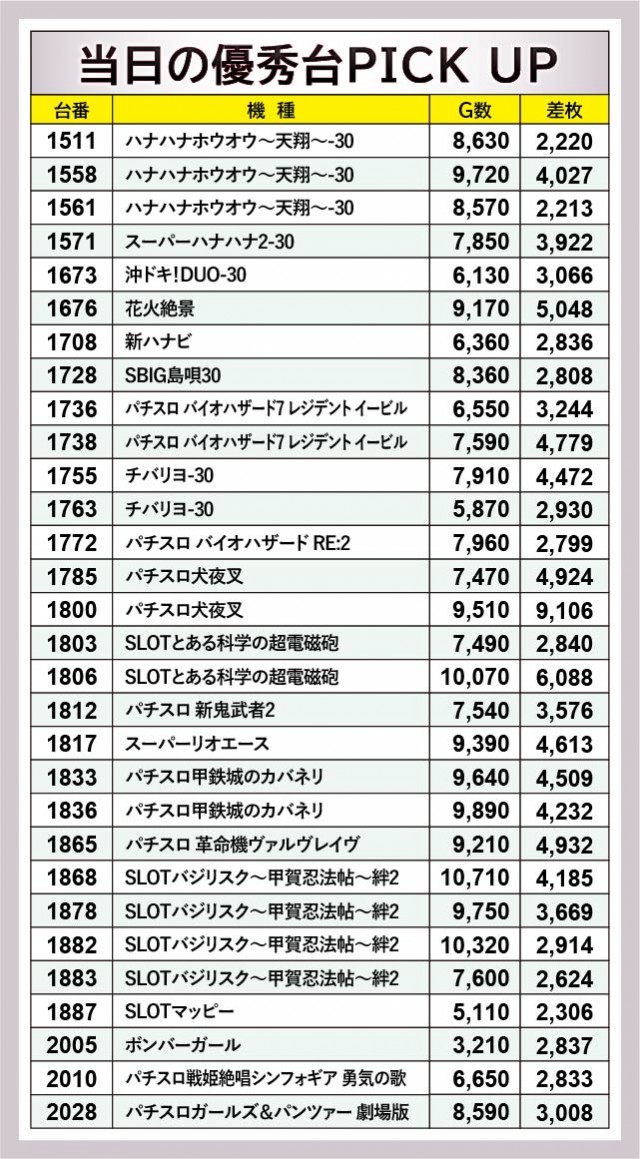 あわや万枚達成という数字を残したのが『パチスロ犬夜叉』だった。1800番台+9,106枚という突出した記録が見られ、他にも4千枚OVERが多々見られる内容になっている。6.5号機に負けじと『SLOTバジリスク~甲賀忍法帖~絆2』では2台の万回転OVERが発生。さらに『ハナハナホウオウ~天翔~-30』は朝から粘り強く戦った形跡もあり、店内は凄まじい活気と熱気に包まれていたと言えるだろう。