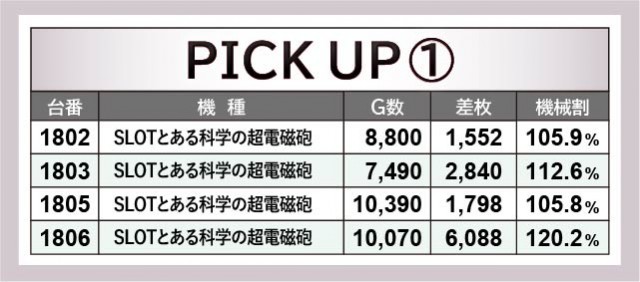 『SLOTとある科学の超電磁砲』は全4台がプラス差枚を達成している。万回転OVERも当然のように発生しており、1806番台+10,070G・+6,088枚という記録から、ファンが相当な手ごたえを感じていた様子を窺わずにはいられない。しっかりとポテンシャルを発揮し、目に見える形で結果を残した点からも、好感を覚えずにはいられないはずだ。