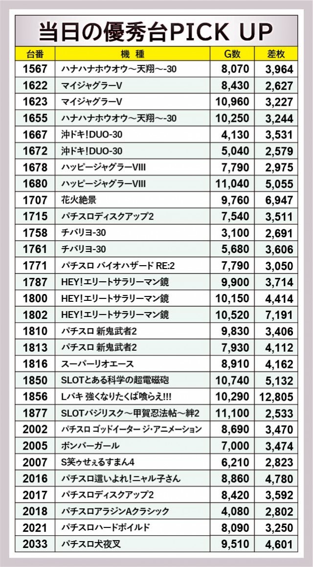 優秀台をチェックしてみると、幅広い機種が名を連ねていることが分かるだろう。その中で突出した成績を収めたが『Lバキ 強くなりたくば喰らえ!!!』1856番台+12,805枚で、スマスロのポテンシャルが存分に発揮された格好となっている。また他にも『ハッピージャグラーVIII』1680番台+5,055枚や『花火絶景』1707番台+6,947枚、『SLOTとある科学の超電磁砲』1850番台+5,132枚といった記録が生まれ、各所にチャンスが散らばりつつも、それぞれが熱気を放った1日となった。