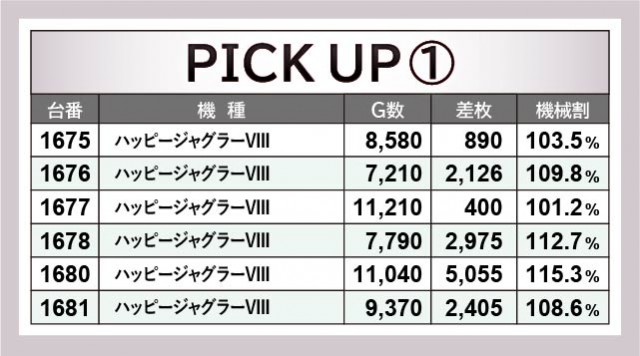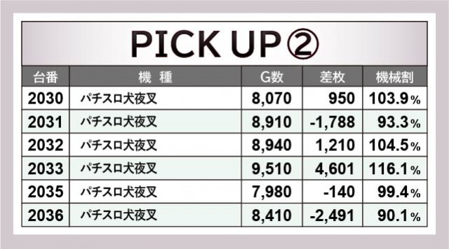 まず注目したいのが、シリーズ最新機種『ハッピージャグラーVIII』から2台の11,000回転OVERが発生したという点だ。1680番台+5,055枚という突出した記録も生まれており、コンスタントなボーナス当選は遊技していたファンを笑顔にしたのは間違いない。また『パチスロ犬夜叉』もじっくりと打ち込まれており、2033番台+4,601枚という記録が発生。全6台がプラスを記録できなかったが、消化されたゲーム数から鑑みるに、手ごたえを感じられた状況だったと窺えるだろう。