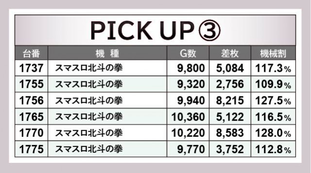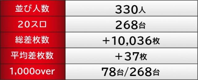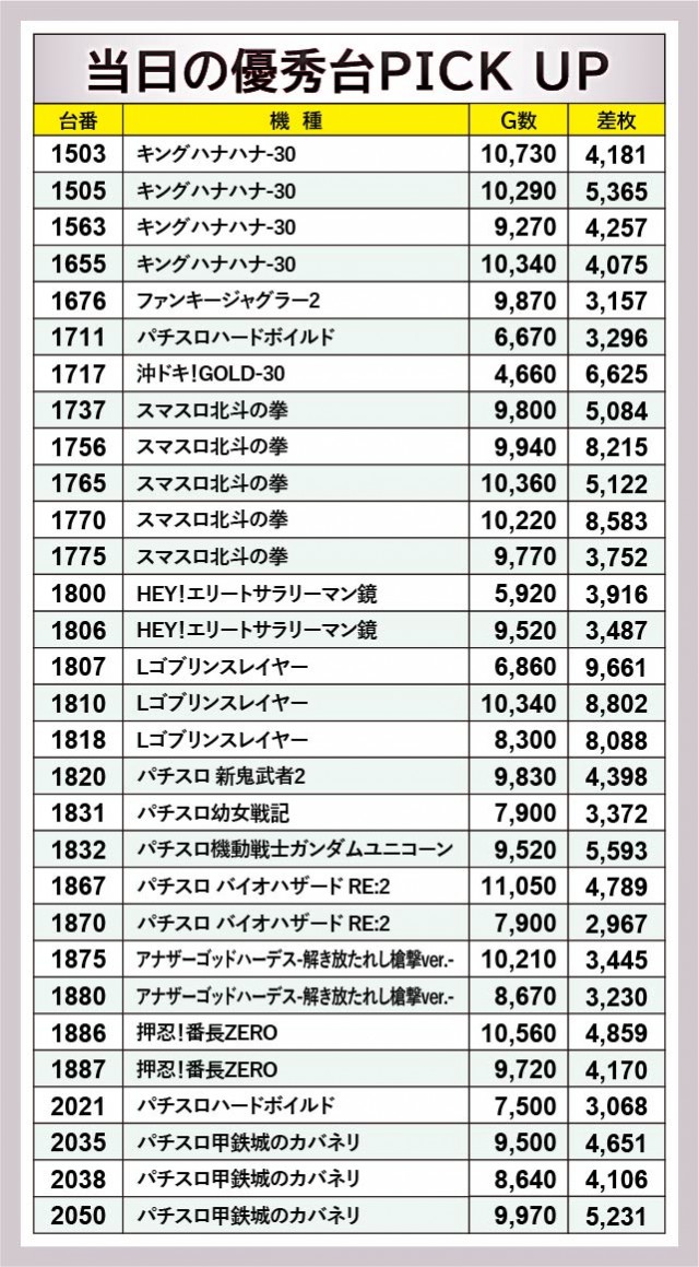 優秀台をチェックすると、9台もの万回転OVERを確認できる。それどころか『Lゴブリンスレイヤー』から8~9千枚OVERが多発、『スマスロ北斗の拳』にて2台の8千枚OVERが見られるなど、朝から閉店まで活気と熱気に満ちていたと言えるだろう。また上表には3千枚OVERからピックアップされており、誰もが相当な手ごたえを感じていたのは間違いない。