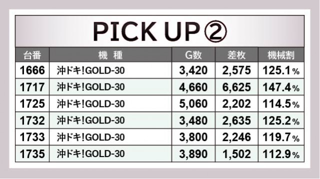 『キングハナハナ-30』から3台の万回転OVERを確認でき、1505番台+5,365枚を筆頭に3台の4千枚OVERが発生。当日の店内の盛り上がりをリードし、大きな存在感を放っていた機種の1つだ。また同じく沖スロから『沖ドキ!GOLD-30』をチェックすると、1717番台+6,625枚という記録が見られる。全体的に回転数が控えめだが、それでも大きな熱気を放っており、チャンスが眠っていたと窺える。