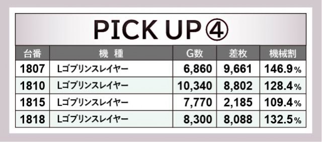 一方でスマスロ勢から、やはり『スマスロ北斗の拳』が人気の筆頭となっていた。朝から閉店まで打ち尽くされており、その中で1756番台+8,215枚・1770番台+8,583枚という記録が打ち立てられ、その存在感は圧倒的であると言える。また新台『Lゴブリンスレイヤー』も1807番台+9,661枚という数字が凄まじい熱気を物語っており、1810番台・1818番台も合わせてあわや万枚達成という状況だったのは、今後も楽しみな存在だ。