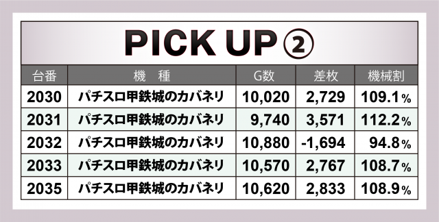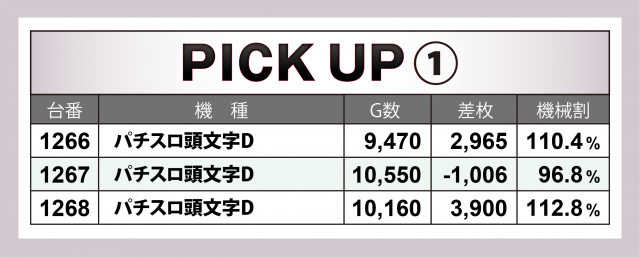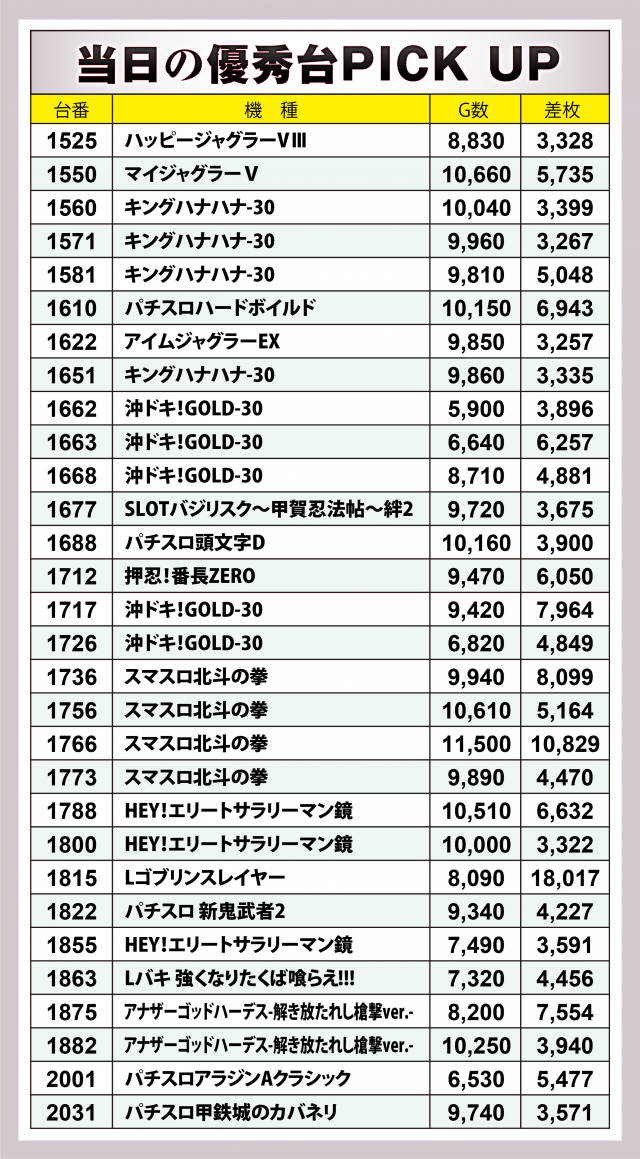 まずは優秀30台のPICK UPから。この日はなんと30台全てが差枚数+3千枚以上を達成、+4千枚以上は全体の3分の2弱となる18台、+5千枚オーバーは半数弱の13台、+6千枚オーバーは9台、+8千枚オーバーが3台と、かなりのハイレベルな内容となった。