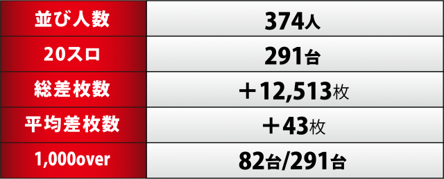 今回、[1000円/46枚] スロ全291台のトータル差枚数は+12,513枚に終わり、10日前に行われた取材時より数値をアップすることに成功。一方、1,000overは総台数が20近く増台したにもかかわらず前回よりも伸ばして3割弱と高水準を叩き出すことができた。連休ど真ん中と言うのに、ハイレベルな実績を見せたことは大きな経験となるだろう。これからも勢いに乗って、どんどん白星を量産していって欲しい。
