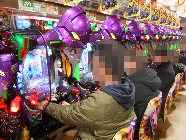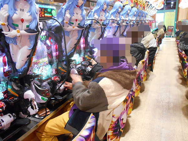 14時ごろの4円パチンコを見てみると「新世紀エヴァンゲリオン〜未来への咆哮〜」や「ぱちんこ シン・エヴァンゲリオン Type レイ」が高稼働。プレイヤーの嬉しそうな表情を多数確認している。