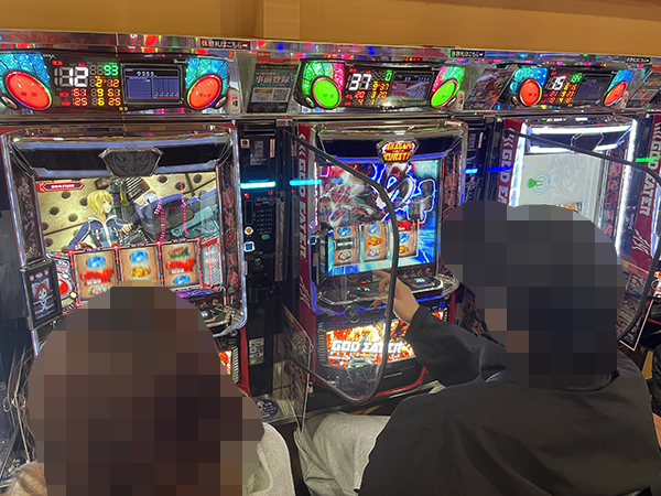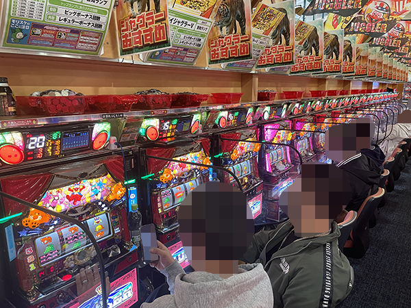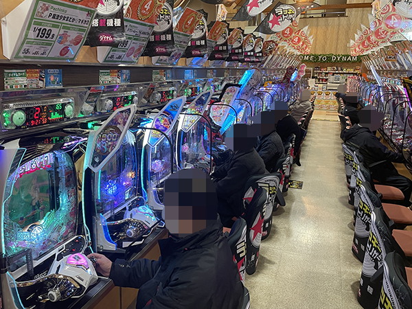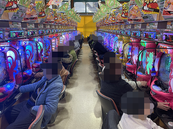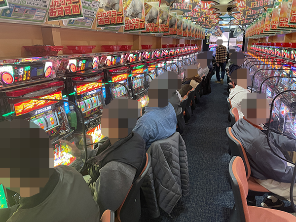 取材時は多くのプレイヤーが来店。パチンコ・パチスロともに、様々な機種が支持を得ていた。