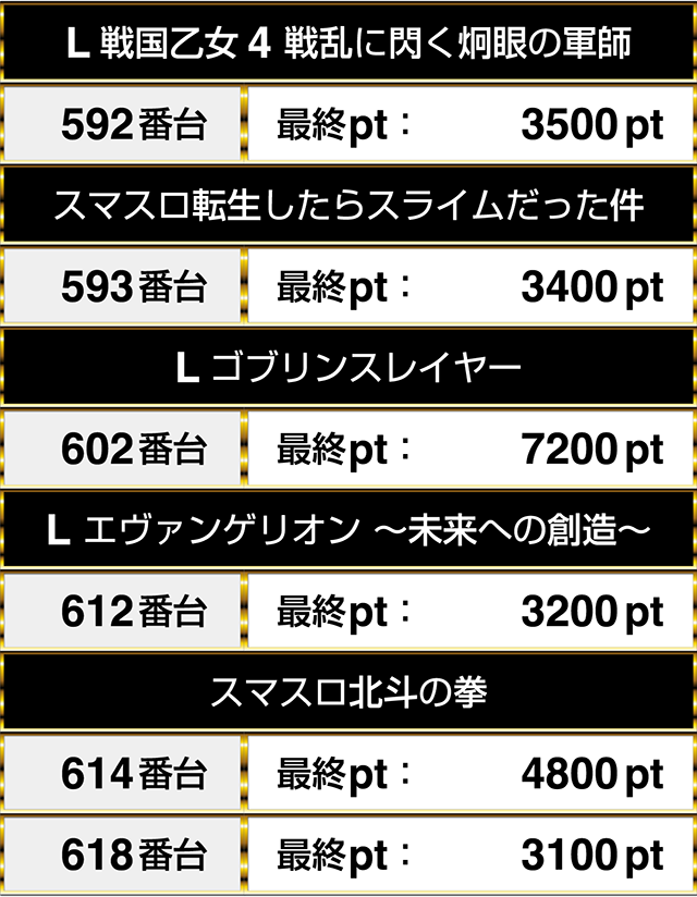最新機種にもプラスptの台があり、593番台の『スマスロ転生したらスライムだった件』や『L エヴァンゲリオン ~未来への創造~』の612番台が3000ptを上回った。
