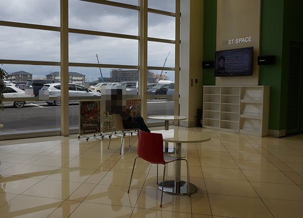 天井が高く、開放的なホール内は清潔感もバッチリ。大きな窓があるレストスペースはとくに明るく、テレビをみながらのびのびと休むことができる。