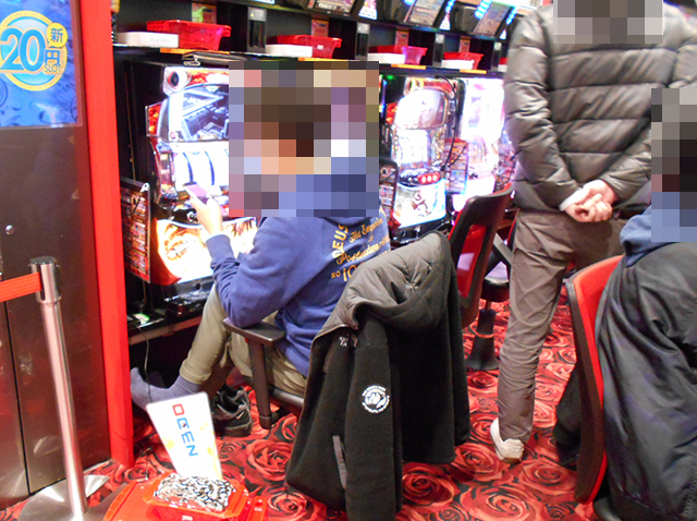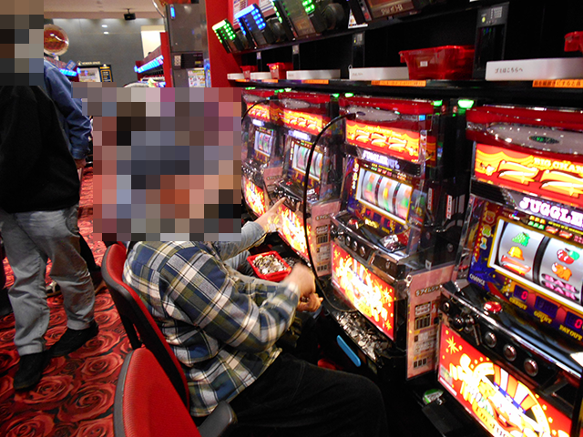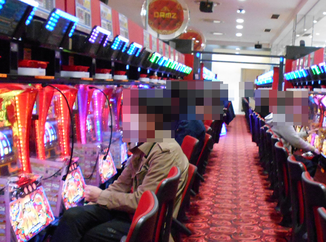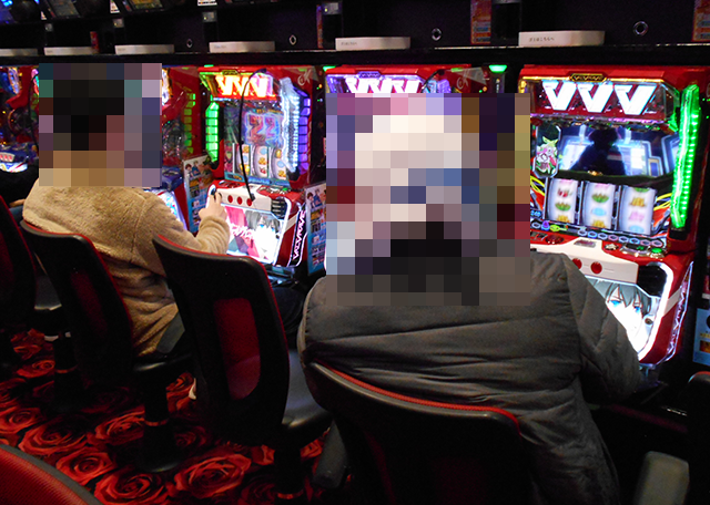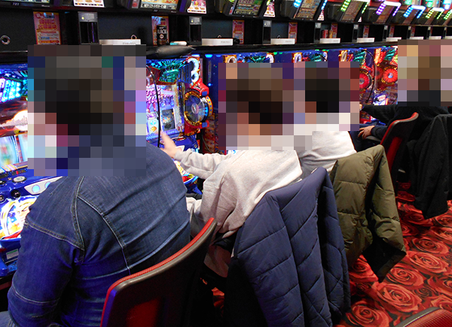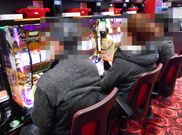 夕方頃のパチスロでは、多くのプレイヤーが笑顔で遊技をおこなっていた。
