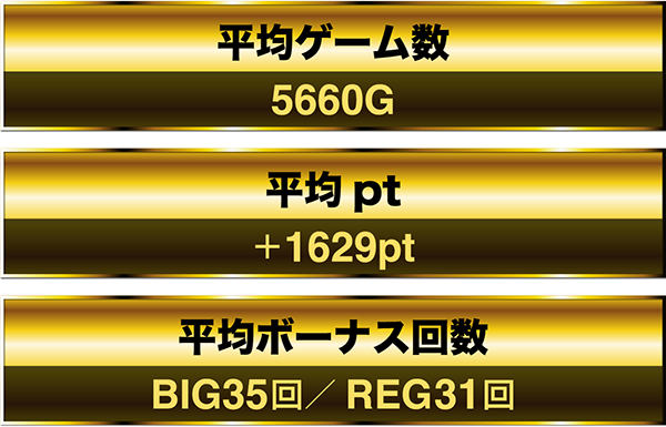 閉店時の平均ゲーム数は5660G。平均ボーナス回数はBIGとREGをあわせて約66回であった。