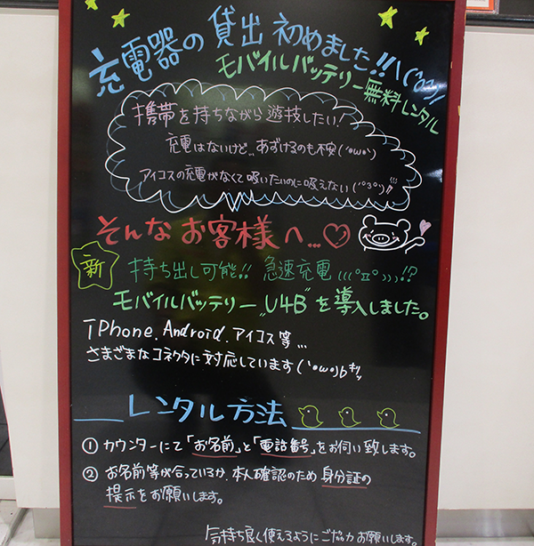 カウンターではモバイルバッテリーを貸し出している。携帯電話や電子タバコを充電したいときに便利だと思えた。