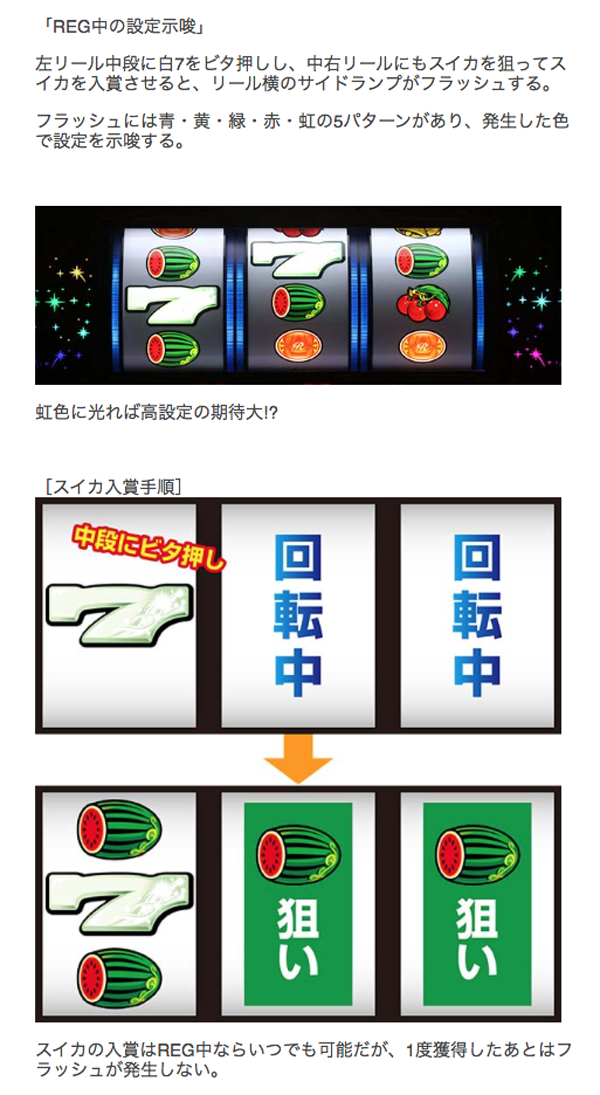 BIG中のスイカ確率やREG中のサイドランプの色など、ボーナス中も設定差がある要素をチェック。
