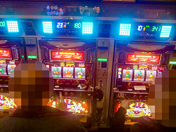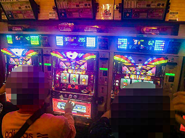 5円パチスロを見ると「ニューアイムジャグラーEX」のにぎわいが大きい。機種性能を上手く引き出すプレイヤーに羨望が集まっていた。