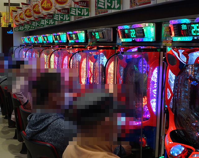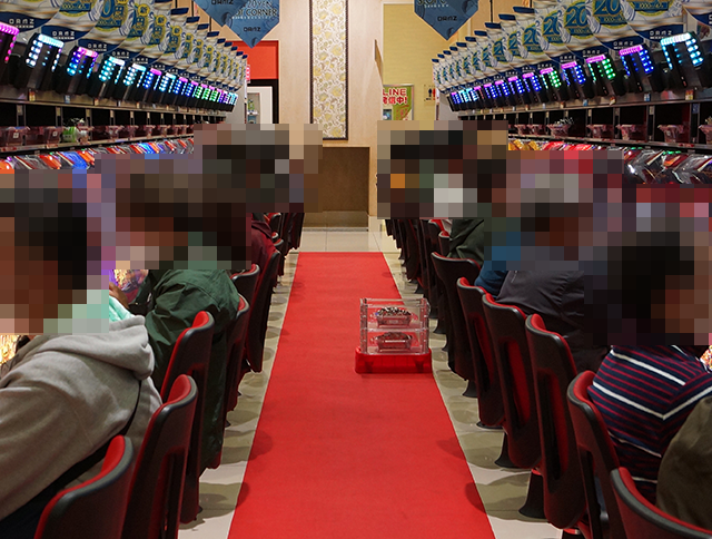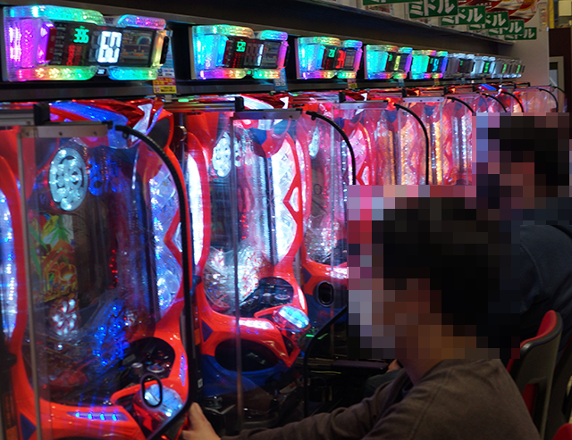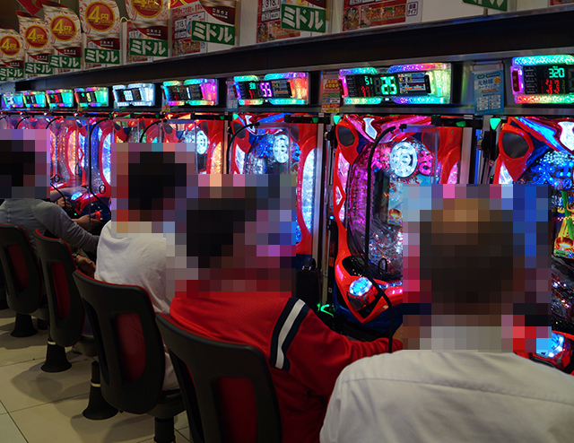 笑顔をみせつつ、遊技をおこなう姿が並んでいる光景は壮観。