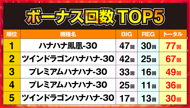 ボーナス回数77回を記録した「ハナハナ鳳凰-30」が単独トップ!