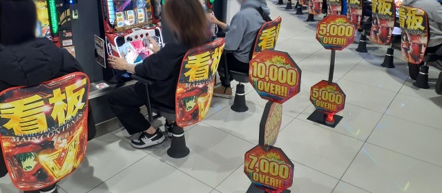 後述する好調5機種や横並び好況スポット以外では差枚数が多かった順に、『忍魂参 ~奥義皆伝ノ章~』が+1万3千枚超、『スマスロ ゴールデンカムイ』が+1万3千枚弱、『スマスロバジリスク~甲賀忍法帖~絆2 天膳 BLACK EDITION』が+1万枚弱を筆頭に3台で+2万枚弱と、店内の至るところでビッグな出玉が飛び出していた。