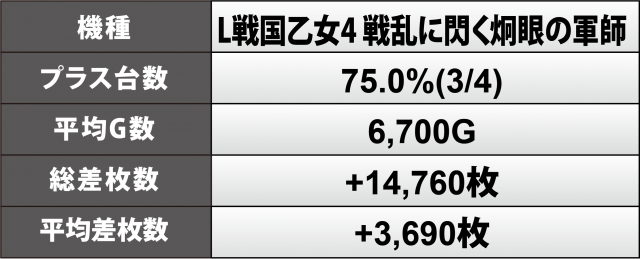 『L戦国乙女4 戦乱に閃く炯眼の軍師』4台で+9千5百枚超を頂点に3台がプレイヤーの勝利となり、1台あたりの平均は+3千7百枚近くとなった。