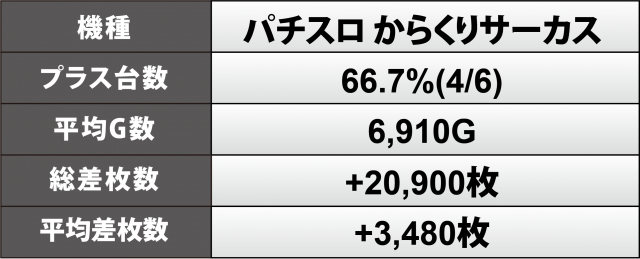 『パチスロ からくりサーカス』は3分の2がプラス、+1万3千枚オーバーをトップに、トータルでは+2万1千枚弱をクリア、こちらの平均も『戦国乙女4』に見劣りしない数値を見せた。