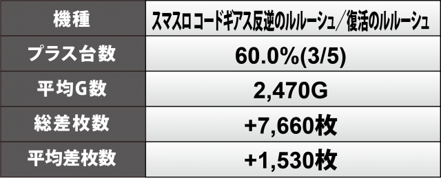 『スマスロ コードギアス反逆のルルーシュ/復活のルルーシュ』の勝率は上2機種には及ばなかったが、+4千枚クラスを2台を輩出し、平均差枚数は4桁をマーク。
