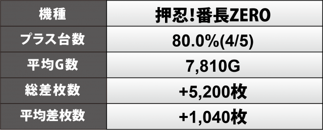 ベテランマシンである『押忍!番長ZERO』も負けていない。プラス台の割合は8割と他4機種を上回り、こちらも1台あたりの平均をプラス4桁で終えた。