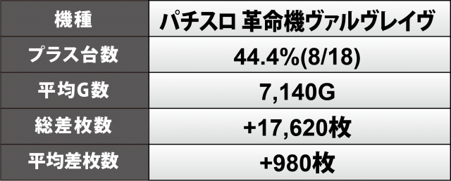 『パチスロ 革命機ヴァルヴレイヴ』では勝率自体が全体の半数に及ばなかった点は残念だったが、万枚突破が2台飛び出し、合算で+1万8千枚に届く手前という数値を果たした。