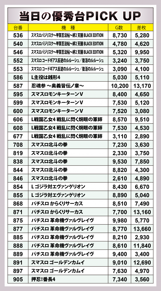 ここからは、入手した出玉データから優秀台の各自を迫っていく。