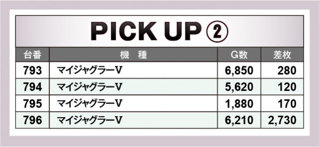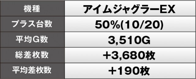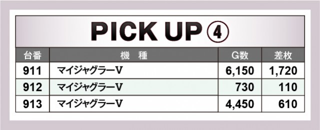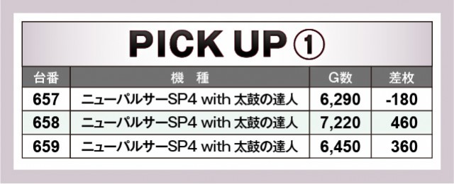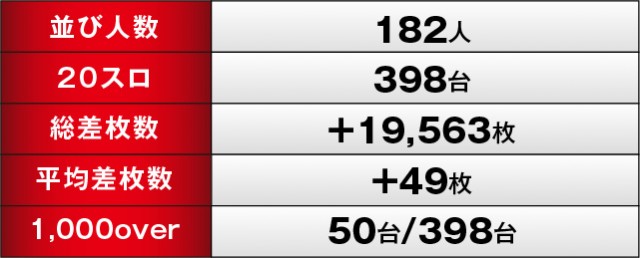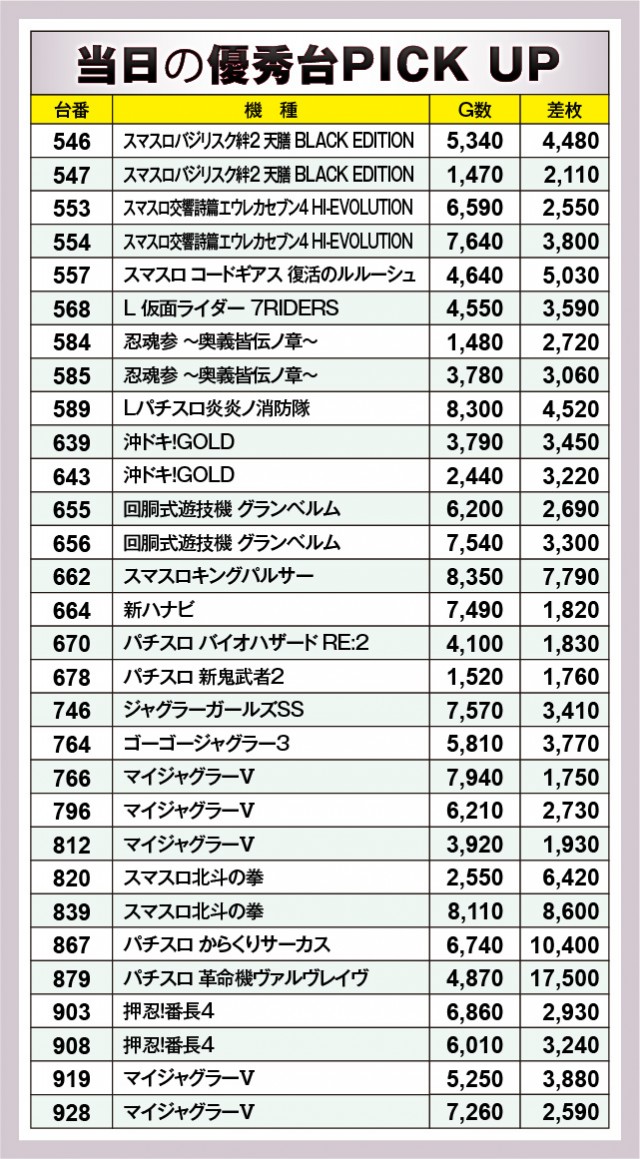 『ニューパルサーSP4 with 太鼓の達人』は大きな熱こそ見られないが、いずれも高い回転数を記録していることから、相当な手応えを感じていたに違いない。それは『マイジャグラーⅤ』も同様で、こちらはシリーズ機の中でも人気が高く、ファンの注目が集まっているのだろう。その中でマイナス差枚を記録せず、しっかりとプラス差枚で終えていることから、同店も丁寧に扱っていることが分かる。