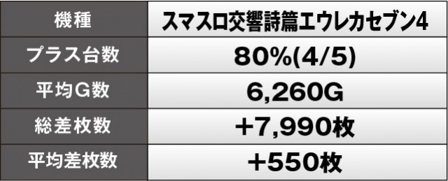 『スマスロ交響詩篇エウレカセブン4 HI-EVOLUTION』は勝率80%、『回胴式遊技機 グランベルム』に関しては100%を記録しており、導入された新台がしっかりと結果を残していたのが鮮烈だ。特に後者は平均差枚数+2,220枚となっており、全台が熱を帯びていた様子が如実に窺える。今後の活躍も楽しみで、ファン諸氏はしっかりと動向をチェックしておく必要があるだろう。