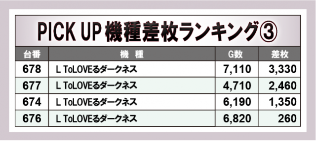 店内では注目すべき機種が多数見受けられた。特に上表の4機種は打ちごたえのある状況が整っていたことから、館内の盛り上がりに大きく貢献していたと言える。いずれも、差枚数プラス4桁を多数輩出しており、多くの台が可能性を秘めていたはずだ。