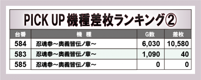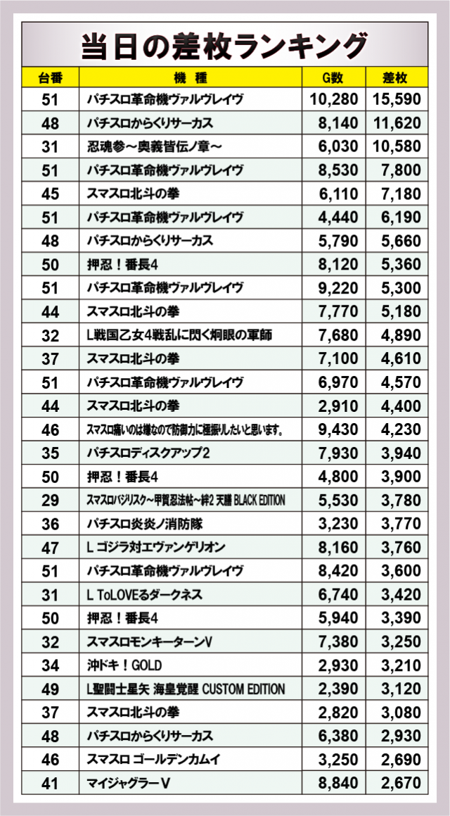 優秀台をチェックしてみると、優秀30台全てが+2,000枚OVERを記録!なかでも、『パチスロ革命機ヴァルヴレイヴ』51番台+15,590枚や、『パチスロからくりサーカス』48番台+11,620枚、『忍魂参~奥義皆伝ノ章~』31番台+10,580枚と3台の万枚OVERが存在し、大きな熱気が放たれていたのが目に焼きつく。