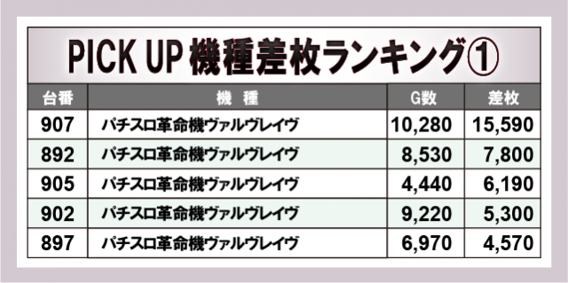 人気のスマスロ機を筆頭に叩きがいのある状況が整っており、ピックアップ全てがプラス差枚とはいかなかったものの、いずれも閉店までじっくりと打ち込まれた形跡が見られる。なかでも、『パチスロ革命機ヴァルヴレイヴ』では多くの台から熱量を感じられ、人気機種の圧倒的な存在感を示していたことが窺える。