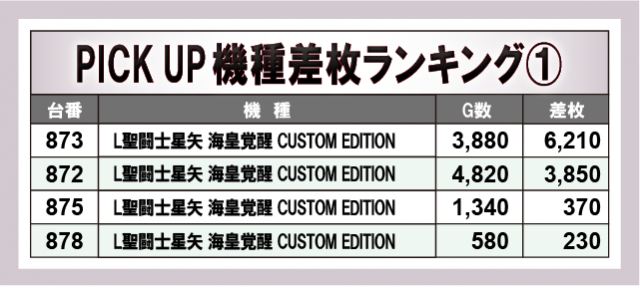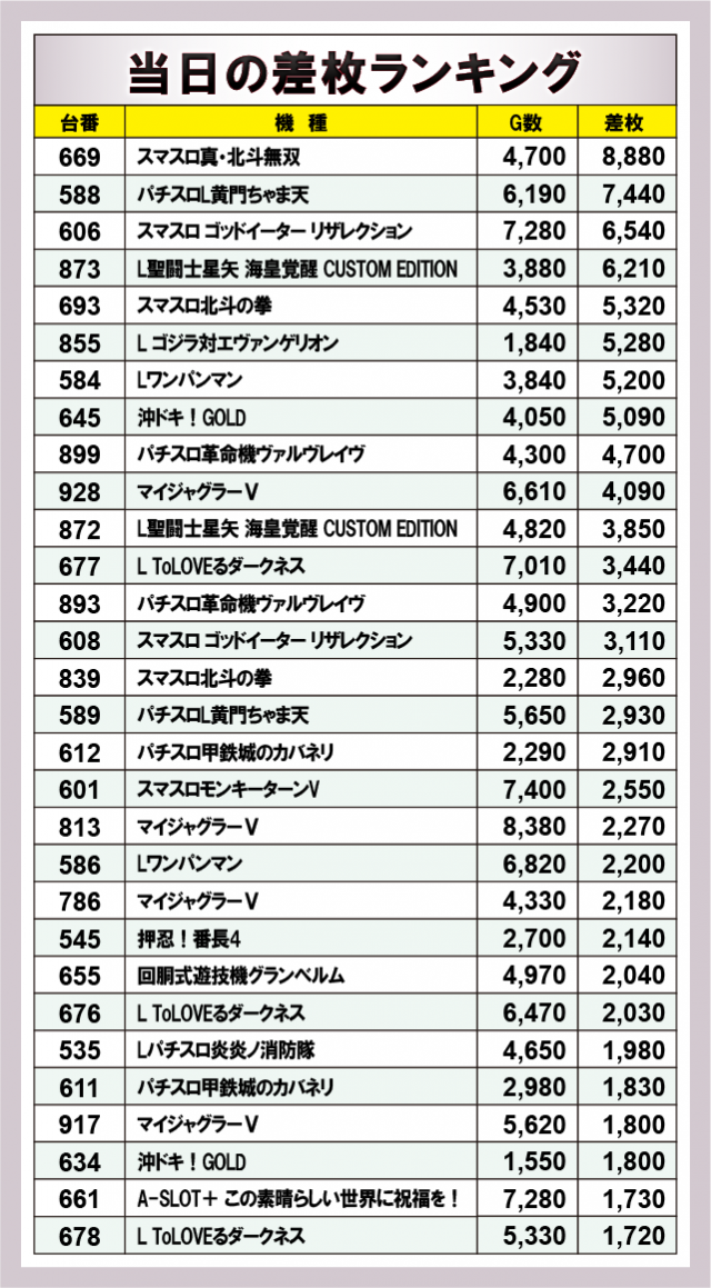 優秀台には人気機種を中心に名を連ねており、『スマスロ真・北斗無双』で+8,000枚OVERをマーク!さらに、『パチスロL黄門ちゃま天』で+7,000枚OVER、『スマスロ ゴッドイーター リザレクション』『L聖闘士星矢 海皇覚醒 CUSTOM EDITION』で+6,000枚OVERなど、様々な機種から大台突破台が存在しており、あらゆる機種にチャンスが眠っていた様子が窺える。
