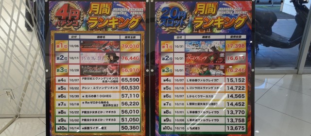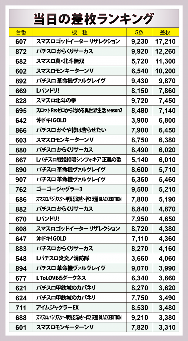 加えて『パチスロ 革命機ヴァルヴレイヴ』では+9,900枚弱・+4,000枚超が1台ずつ&+5,000枚超×2、新台『Lバンドリ!』では+7,900枚弱・+4,700枚弱が1台ずつ、『スロット Re:ゼロから始める異世界生活 season2』に+7,100枚超、『沖ドキ!GOLD』では+6,800枚超・+4,400枚弱が1台ずつ、『パチスロ かぐや様は告らせたい』に+6,500枚弱、『スマスロモンキーターンⅤ』に+6,400枚弱、『Lパチスロ戦姫絶唱シンフォギア 正義の歌』に+6,000枚超、『スマスロバジリスク~甲賀忍法帖~絆2 天膳 BLACK EDITION』に+5,200枚弱と、幅広いラインナップが好記録を残した。