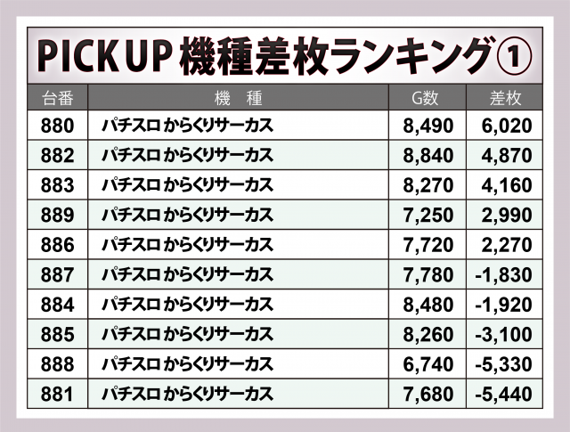 『パチスロ からくりサーカス』では+6,000枚超・+3,000枚弱が1台ずつ&+4,000枚超×2となった上に、他のシマで872番台が+12,300枚弱というビッグヒットを果たした。