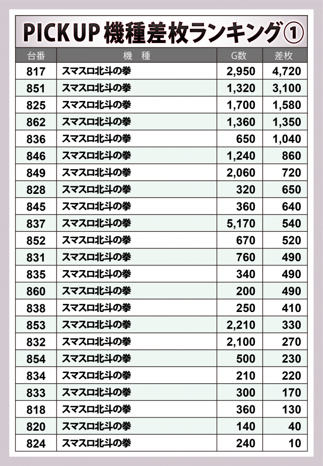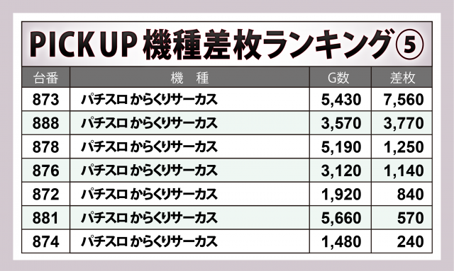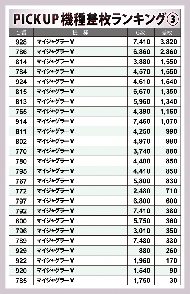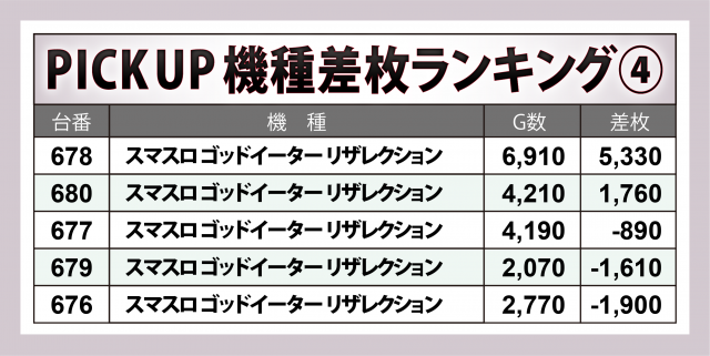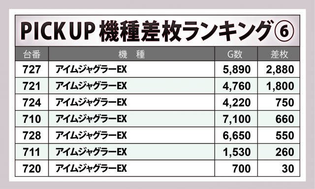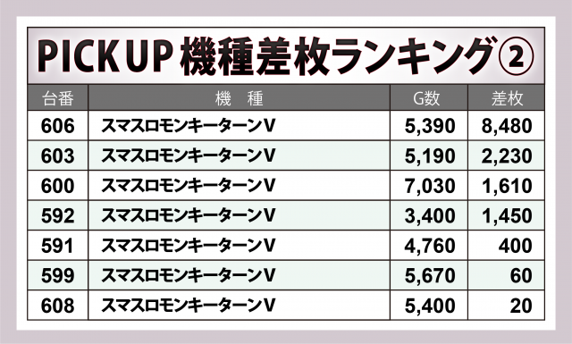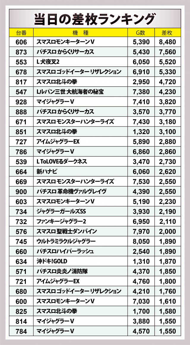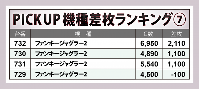 残念ながら今回は5桁プラスの台がカウントできなかったが、30台ランキングや特選7機種が導いた差枚数は高水準であり、勝機が数多く秘められていたと言えよう。