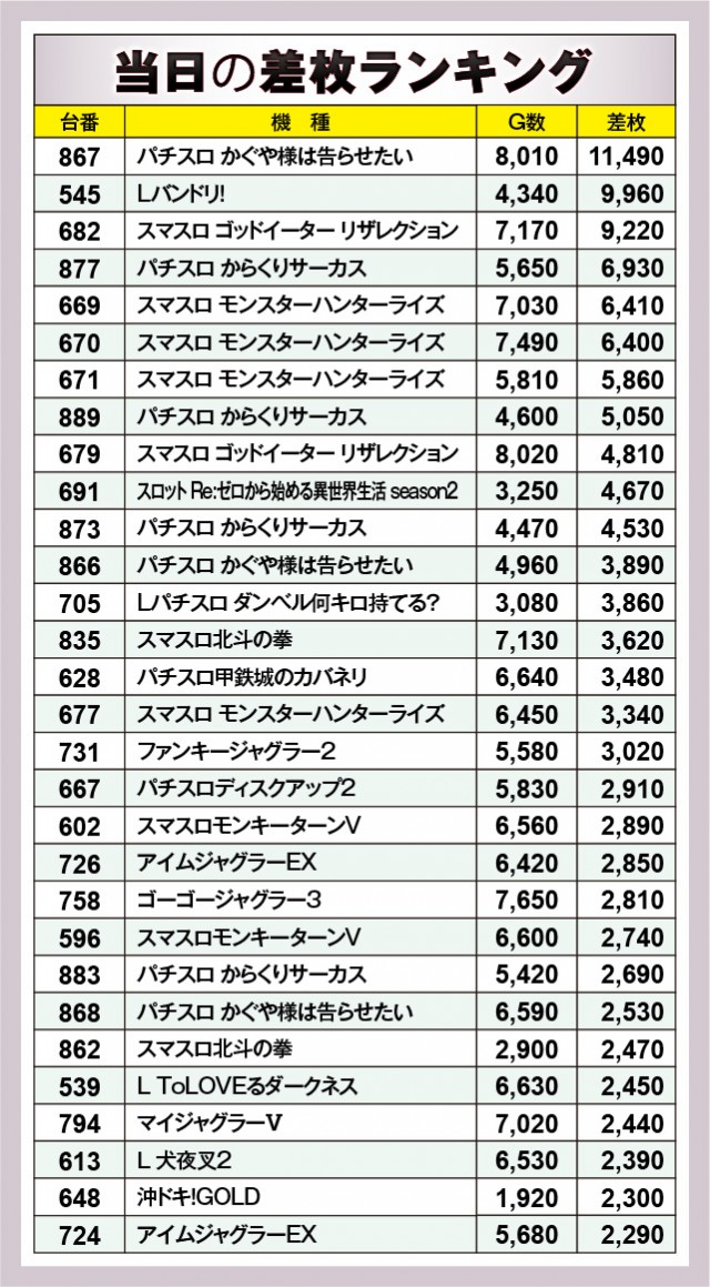 『パチスロ かぐや様は告らせたい』にて万枚OVERが発生し、さらに『Lバンドリ!』『スマスロ ゴッドイーター リザレクション』から万枚に迫る9,000枚OVERを披露。その他にもまとまった出玉を確保する台が多くなっており、館内を包んでいた熱気の高さが窺えるばかりだ。また高い回転数も目に焼きつく部分で、ファンは充実のひと時を過ごしていたのではないだろうか。