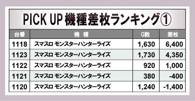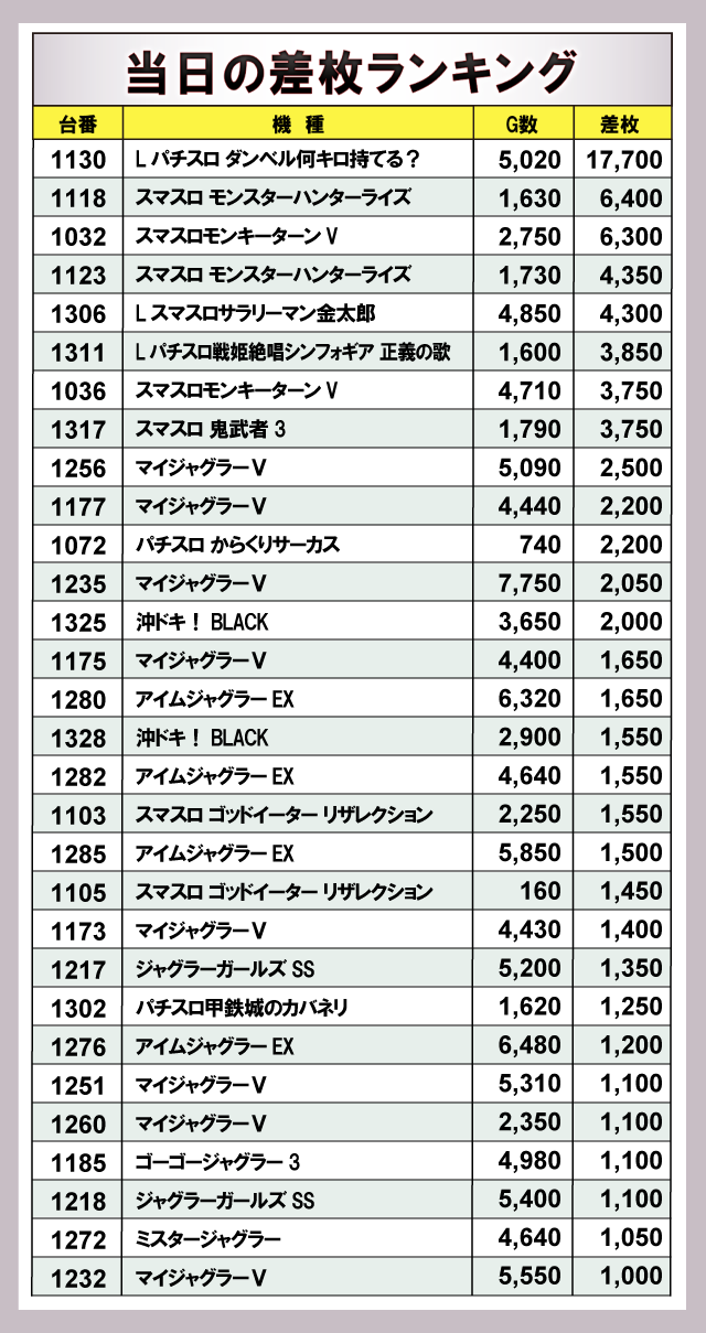 なんと『Lパチスロ ダンベル何キロ持てる?』から、コンプリート目前の+17,700 枚をマーク!遊技していたファンはレバーオンに力が入ったことだろう。他にも、『スマスロ モンスターハンターライズ』『スマスロモンキーターンV』から、+6,000枚OVERが飛び出すなど、多くの台がまとまった出玉を確保しており、店内は大きな熱気に包まれていたようだ。