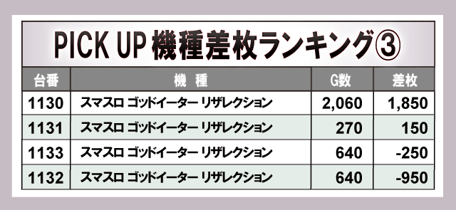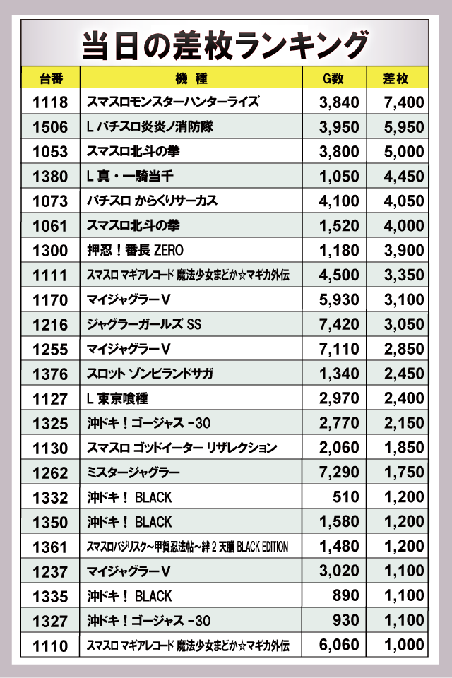 特に盛り上がっていた機種に注目してみると、『押忍!番長ZERO』で全台プラス差枚と熱気が放たれていた。その他の機種も好成績を収めており、ファンは有意義な時間を過ごせたことだろう。